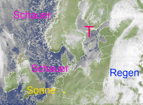 In der einfließenden etwas kälteren Polarluft ziehen von der Nordsee einige Schauer nach Mitteleuropa, die teilweise als Schnee oder Schneeregen fallen fallen können. In den Bergen bleibt es winterlich. Nachts klart der Himmel gebietsweise auf und es muss verbreitet mit Glätte durch überfrierender Nässe gerechnet werden.