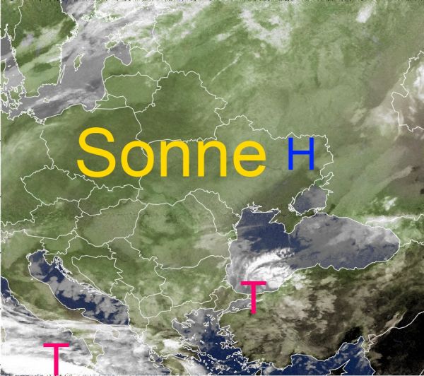 Über dem Kontinent erkennt man große wolkenfreie Gebiete mit reichlich Sonnenschein. Am Bosporus, sowie im zentralen Mittelmeerbereich drehen Tiefs munter ihre Kreise und sorgen für Regen- und Schauerwolken.