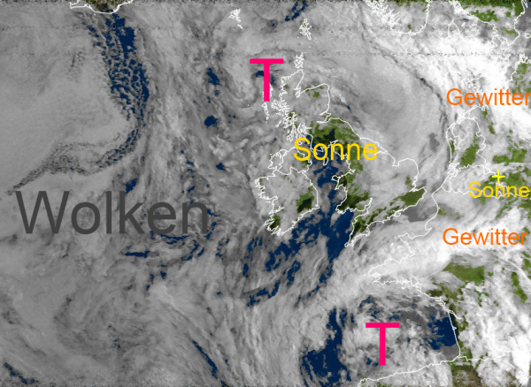 Wie schon seit längerer Zeit über dem Kontinent, so herrschen auch über dem Atlantik momentan nur geringe Luftdruckgegensätze. Wegen der schwachen Luftbewegung haben sich viele Wolken gebildet, die sich praktisch kaum von der Stelle bewegen. Nennenswerten Regen enthält diese meist tiefhängende Haufenschichtbewölkung aber nicht.