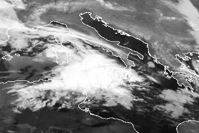 Der weiße Wolkenfleck über dem Mittelmeer gehört zu einem kleinen Tief das von Tunesien in Richtung Norditalien zieht. Es sorgt heute für zum Teil kräftige Schauer und Gewitter, vor allem über Korsika und Sardinien.