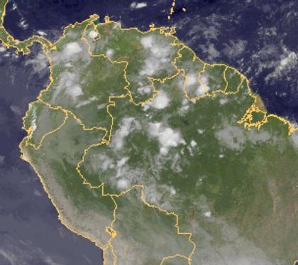 Über dem Norden Südamerikas entwickeln sich Schauer und Gewitter. Die Zellen dieser konvektiven Systeme sind im Satellitenbild deutlich zu erkennen.