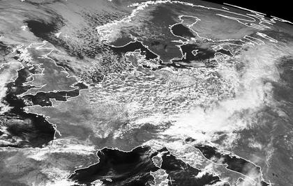 Von den Alpen bis zum Baltikum erstreckt sich am Donnerstag Mittag ein Wolkenband, das zur Kaltfront von Tief 'Munir' gehört. Dahinter strömt aus Norden kalte Luft ein, die über der Nordsee mit Feuchtigkeit angereichert wird. Dadurch haben sich zahlreiche Schauer gebildet, die an dem Flickenteppich auf dem Satellitenfoto gut zu sehen sind. Über Skanidinavien und der Ostsee befinden sich jedoch kaum Schauer, hier sorgt der Föhneffekt des Skandinavischen Gebirges für Wolkenauflösung. Auch über Westfrankreich und Großbritannien sind die Wolken seltener, hier bringt Hoch 'Susi' trockenes Wetter. (Bildquelle: NERC Satellite Receiving Station, Dundee University, Scotland, http://www.sat.dundee.ac.uk/)