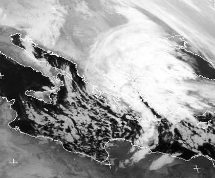 Ein kräftiges Sturmtief über der Ägäis sorgt am Donnerstag für einen Kaltlufteinbruch in weiten Teilen Griechenlands, in Mazedonien, Bulgarien und dem Nordwesten der Türkei. Bei frostigen Temperaturen und Wind in Sturmstärke drohen Schneeverwehungen. Auf der Ostseite des Tiefs kommt kalte Luft, gut an den scheckigen Schauerwolken zu erkennen, bis zu nordafrikanischen Küste voran. Auf der Ostseite des Wirbels wird Warmluft nach Norden gelenkt. Heftiger Regen und Gewitter in der Türkei sind die Folge. Dort, wo die warme Luft auf die kältere Luftmasse aufgleitet, bilden sich weit ausladende hohe Wolken. Ihr helles Wolkenfeld reicht bis in die Ukraine.