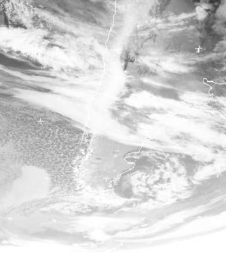Die Kaltfront eines Sturmtiefs südlich von Feuerland liegt mit ihren Wolken über Chile und Argentinien. Dabei kommt es vor allem auf der Westseite der Anden zu kräftigen Regen- und Schneefällen. Weiter südlich folgen Schneeschauer. (Bildquelle: NERC Satellite Receiving Station, Dundee University, Scotland, http://www.sat.dundee.ac.uk/)