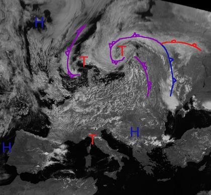Zwei Tiefdruckgebiete liegen mit einigen dichten Wolken über Skandinavien. Tief 'Rainer' im Westen dun Tief 'Steffen' im Osten sorgen für Regen, Schauer und Gewitter. An ihrer Südseite strömt dabei feuchte Luft in weite Teile Mitteleuropas, wo sich ebenfalls zahlreiche Schauer- und Gewitterwolken zeigen. Hochdruckeinfluss mit weniger Wolken herrscht dagegen in weiten Bereichen des Mittelmeers. Die Okklusion von Tief 'Rainer' zieht morgen mit viel Regen und Wind nach Nordwestdeutschland.
