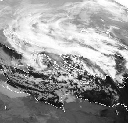 Der beeindruckende Wirbel mit Zentrum zwischen Griechenland und Italien sorgt vor allem im ehemaligen Jugoslawien für teilweise ergiebigen Schneefall. Die kalte Luft über dem warmen Mittelmeer sorgt für kräftige Schauer von Sizilien über Griechenland bis zur westlichen Türkei, gut an dem scheckigen Wolkenmuster zu erkennen. Vor allem zwischen Sizilien und Tunesien strömt die Luft in Sturmstärke.
