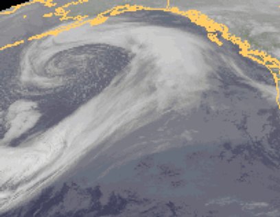 Über dem Nordpazifik liegt ein kräftiges Sturmtief mit einem ausgeprägten Wolkenwirbel. Die dichte Wolkendecke auf seiner Vorderseite zieht nun an die kanadische Westküste, wo sie ergiebigen Regen bringt.