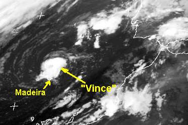 Über dem Atlantik nördlich der portugiesischen Insel Madeira hat sich der Hurrikan 'Vince' aufgebaut, seine Windgeschwindigkeiten erreichen zur Zeit 120, in Böen bis 150 km/h. Berechnungen zufolge verlagert er sich nach Nordosten und schwächt sich dabei zu einem Tiefdruckgebiet ab. Am Dienstag und Mittwoch erreicht das Tief die portugiesische Westküste und sorgt hier für kräftige Regenfälle.