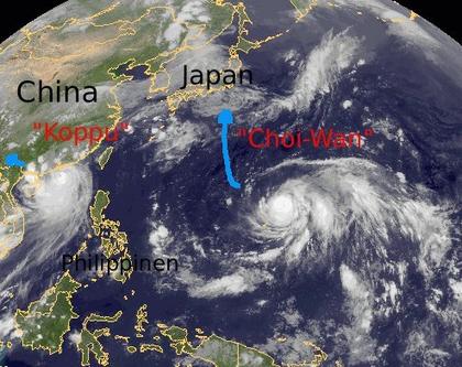 An der chinesischen Küste liegt der Tropensturm 'Koppu' mit Windgeschwindigkeiten von 110 km/h im Mittel und bis 140 km/h in Böen. 'Koppu' zieht auf das Land weiter und wird sich dann rasch abschwächen, aber noch einigen Regen bringen. Weit vor der Küste vor China liegt der Taifun 'Choi-Wan', aktuell befindet er sich über den Marianen. Dabei weist er 150 km/h im Mittel und bis 185 km/h in Böen auf. Voraussichtlich zieht der Wirbelsturm unter Verstärkung in nordwestliche Richtung weiter, dabei könnte er in den nächsten Tagen Japan erreichen.