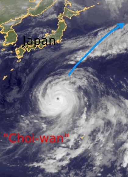 Taifun 'Choi-wan', der südlich von Japan liegt, weist aktuell Windgeschwindigkeiten von 240 km/h auf, in Böen werden sogar bis 300 km/h erreicht. Im Zentrum des Wirbelsturms ist ein deutlich ausgeprägtes Auge vorhanden, zudem fällt aus den Wolken teils heftiger Regen. 'Choi-wan' zieht unter Abschwächung in nordöstliche Richtung weiter, Ausläufer des Taifuns könnten dabei Japan an der Südküste treffen. Das Hauptgebiet des Sturms wird aktuellen Berechnungen zufolge Japan aber verschonen.