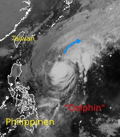 Der Taifun 'Dolphin' hat heute seine maximale Stärke erreicht. In dem Wirbelsturm herrschen Windgeschwindigkeiten von 155 km/h im Mittel und 195 km/h in Böen. Die Philippinen wurden vom Taifun verschont. Da er nun in eine nordöstliche Bahn einschwenkt, bleibt auch Taiwan wohl vor ihm sicher. Zudem schwächt der Sturm sich jetzt auch bald ab. (Bildquelle: Copyrigt EUMETSAT, NERC Satellite Receiving Station, University of Dundee)