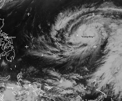Der Taifun 'Kong-Rey' befindet sich derzeit im Pazifik über Mikronesien. Seine Windgeschwindigkeiten erreichen in Spitzen 180 km/h. In den nächsten tagen soll sich der Taifun noch weiter verstärken und in Richtung Norden weiter ziehen.