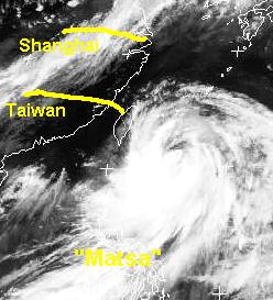 Der Taifun 'Matsa' im Ostchinesischen Meer hat sich weiter verstärkt und zieht zur Zeit mit Windgeschwindigkeiten von 150, in Böen 185 km/h weiter nach Nordwesten auf die Südsostküste von China zu. Berechnungen zufolge soll er östlich ab Taiwan vorbeiziehen und am Sonntag nahe Shanghai die chinesische Küste streifen und weiter nach Norden ziehen.