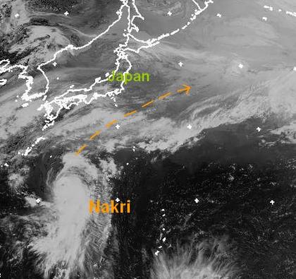 Der Ausschnitt zeigt Taifun 'Nakri' über dem westlichen Pazifik. Er zieht mit den mittleren Windgeschwindigkeiten von 100, in Böen bis zu 130 km/h nach Nordosten etwa 400 km südöstlich von der japanischen Küste und sorgt vor allem für kräftige Regenfälle im Land. (Bildquelle: NERC Satellite Receiving Station, Dundee University, Scotland, http://www.sat.dundee.ac.uk/)