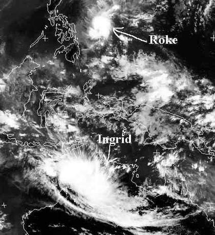 Taifun 'Ingrid' ist gestern mit Windgeschwindigkeiten von 240, in Böen bis zu 300 km/h auf die australische Bordwestküste getroffen und zieht jetzt weiter ins Landesinnere, dabei löst er sich schnell auf. Über dem Pazifik erkennt man den neuen Taifun 'Roke'. Nach den neuesten Berechnungen zieht er in den nächsten Tagen mit Windgeschwindigkeiten von etwa 120, in Böen 150 km/h über die Philippinen hinweg und nimmt danach Kurs auf Vietnam.