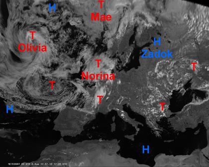 Auf dem Satellitenfoto ist Europa zum überwiegenden Teil durch Hochdruckeinfluss und wolkenarmen Wetter beherrscht. Ein ausgeprägtes Tiefdrucksystem bei den Britischen Inseln bringt dort und ebenso vom nördlichen Frankreich bis in den Westen Deutschland zum Teil kräftige Schauer oder Gewitter. Einzelne Schauer oder Gewitter entwickeln sich ebenfalls im östlichen Europa.