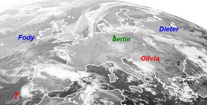Tief „Olivia“ bringt in Mittel- und Südosteuropa viele Wolken mit Regen oder Schauern, am Dienstag erreichen seine Ausläufer Westdeutschland und die Beneluxländer. Von den Britischen Inseln bis nach Frankreich sorgt Hoch „Fody“ für wolkenarmen Himmel, auch in Russland gibt es unter dem Einfluss von Hoch „Dieter“ ruhiges Wetter. (Bildquelle: NERC Satellite Receiving Station, Dundee University, Scotland, http://www.sat.dundee.ac.uk/)