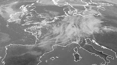 Über weiten Teilen Mitteleuropas liegt dichte Bewölkung, die zum Tief 'Alfons' mit seinem Zentrum über Detuschland gehört. Es brachte teilweise ergiebige Niederschläge und zieht nun weiter nach Polen. Auf seiner Rückseite fließt mit einer nordwestlichen Strömung weiterhin feucht-kühle Luft nach Deutschland, so dass sich Schauer und Gewitter bilden können. (Bildquelle: EUMESAT)