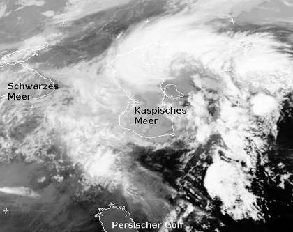 Ein Tief am Kaspischen Meer sorgt derzeit hier und bis zum Schwarzen Meer und Persischen Golf Schauer, die in den nördlichen Teilen auch als Schnee fallen.