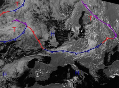 Tief 'Claus' mit Zentrum über dem Baltikum sorgt mit seinen Ausläufern heute für einige Wolken über Ost- und Mitteleuropa. Die Kaltfront des Tiefs erstreckt sich dabei von Weißrussland bis zur Bretagne. Auf dem Atlantik liegt das neue Tief 'Dennis' mit vielen Wolken und Regen. Nach Süden hin herrscht dagegen Hochdruckeinfluss und häufig sonniges Wetter, nur vereinzelt zeigen sich Gewitterwolken. Der Hochdruckeinfluss dehnt sich morgen bis nach Mitteleuropa aus, sodass es auch in Deutschland zu mehr Sonnenschein kommt.