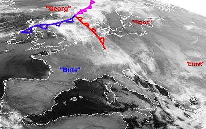 Die Warmfront von Tief 'Georg' westlich von Norwegen sorgt heute für Regen, örtlich auch für Schnee in Deutschland. Auch in Osteuropa bringen weitere Tiefdruckgebiete Wolken mit Regen oder Schnee. In Spanien und Frankreich herrscht unter Hoch 'Birte' meist trockenes, aber trübes Wetter vor.