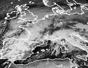 Das Tief 'Gisela' mit Zentrum über dem Ärmelkanal lenkt auf seiner Ostseite warme Luft nach Deutschland. Seine Warmfront erkennt man in der dichten Bewölkung an Nord- und Ostseeküste. Die dichten Wolken der Kaltfront liegen über Frankreich. Dazwischen waren die Wolken am Freitagmittag teils auch aufgelockert. (Bildquelle: NERC Satellite Receiving Station, Dundee University, Scotland, http://www.sat.dundee.ac.uk/)