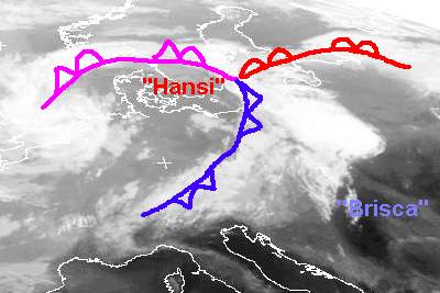 Der Ausschnitt zeigt das Tief 'Hansi' mit Zentrum über der Ostsee, am Freitag Abend und in der Nacht zum Samstag sorgte es für teils schwere Gewitter in Deutschland, dabei wurden in Böen Windgeschwindigkeiten von 60 bis 115 km/h, auf dem Fichtelberg sogar bis 150km/h gemessen. In Schauern sind vor allem in Südostdeutschland 15 bis 40 l/qm zusammen gekommen. Am Sonntag liegt die Okklusionfront des Tiefs über der Nordsee und dem Baltikum, im Laufe des Tages bringt sie vor allem in Nord- und Westdeutschlandneuen schauerartigen Regen.