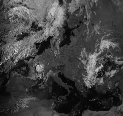 Weite Teile Europas sind unter Hochdruckeinfluss immer noch wolkenarm. Über den Britischen Inseln sind dichte Wolke von Tief 'Mae' mit Zentrum über den Shetlandinseln zu sehen.