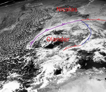 Die Wolken des Tiefs 'Olander' vor der Küste Frankreichs liegen heute Mittag über vielen Teilen des mittleren und westlichen Europas. Weiter im Westen auf dem Atlantik zeigen sich viele Schauerzellen, die mit kalter Luft nach Süden gelangen. Zwischen Island und Skandinavien befinden sich auch noch die Wolken des Tiefs 'Nicolas'. 'Olander' zieht bis zum Wochenende über Deutschland hinweg, sodass in Mittelleuropa der Weg frei wird für kältere Luft aus dem Norden. (Bildquelle: NERC Satellite Receiving Station, Dundee University, Scotland, http://www.sat.dundee.ac.uk/)
