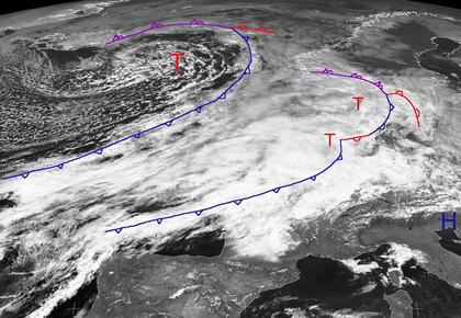 Von Nordfrankreich bis nach Nordwestdeutschland und Südskandinavien zeigt das Satellitenbild von Mittwoch Mittag starke Bewölkung, die zum Tief 'Tiffany' gehört. Weiter nach Nordwesten befindet sich ein zweites Tief namens 'Ursula', auf dessen Rückseite Schauerbewölkung zu sehen ist. In Richtung Mittelmeer sind die Wolken seltener. In der Nacht ziehen die Ausläufer von 'Tiffany' über Deutschland hinweg, in der Folge auch die Fronten von 'Ursula'. Damit wird es am Donnerstag sehr wechselhaft. (Bildquelle: Copyrigt EUMETSAT, NERC Satellite Receiving Station, University of Dundee)