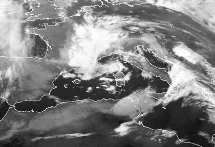 Der Ausschnitt zeigt das kleine Tief über den Seealpen. Man erkennt sehr schön die Wolkelücke über Nordwest-Italien welche durch die nördliche Bodenströmung verursacht wird. Aus den Wolken über dem Südwesten und der Mitte Deutschlands gehen Regen und Regenschauer nieder. Über Süditalien und Tunesien liegen die Wolken der zugehörigen Kaltfront.