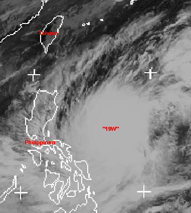 Das tropische Tiefdruckgebiet '19W' (noch ohne Namen, da kein Sturm) liegt derzeit östlich der Philippinen im Pazifik. Dabei werden in Böen Windgeschwindigkeiten bis zu 80 km/h gemessen. '19W' soll nu weiter Richtung Norden ziehen und sich dabei zum Sturm verstärken. Der weitere Weg ist aber noch unklar.