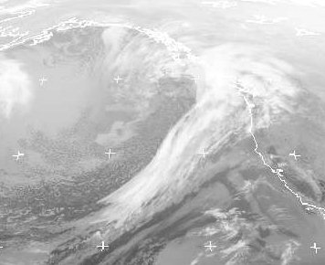 Westlich von British Columbia liegt das zentrum eines Tiefdruckwirbels. Seine Kalfront zieht mit Regen an der Küste nach Süden bis nach Kalifornien. Auf ihrer Rückseite strömt kühlere Luft mit lockerer Schauerbewölkung nach Süden.