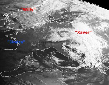 Auf dem Satellitenbild von Mittwoch früh haben die Wolken von Tief 'Willy' über Island die Nordsee erfasst und reichen bis ins norddeutsche Tiefland. Mit den Wolken ziehen auch geringe Niederschläge herein. Im Südwesten Europas und Teilen Mitteleuropas ist es unter dem Einfluss von Hoch 'Jindra' wolkenlos oder gering bewölkt. Im Südosten dagegen sorgen die kompakten Wolkenfelder von Tief 'Xaver' für teils kräftige und gewittrige Niederschläge. (Bildquelle: NERC Satellite Receiving Station, Dundee University, Scotland, http://www.sat.dundee.ac.uk/)