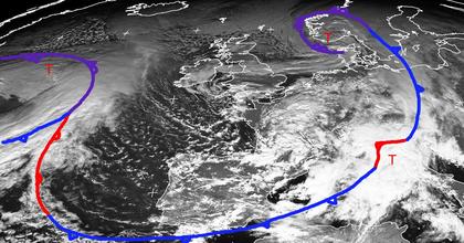 Während das Sturmtief 'Jette' mit seinen Wolken bereits über Skandinavien angekommen ist, formiert sich auf dem Atlantik schon ein neues Tief namens 'Karin'. es zieht mit rascher Geschwindigkeit heran und erreicht schon morgen den Westen Deutschlands. Über Norditalien liegt ein namensloses Randtief, das sich mit Jette verbunden hat und im westlichen Mittelmeer für Wolken, Regen, Gewitter und starken Wind sorgt. Zwischen diesen drei Tiefdruckgebieten erkennt man eine Zone geringer Bewölkung, in der sich aber einige Schauer gebildet haben. (Bildquelle: NERC Satellite Receiving Station, Dundee University, Scotland, http://www.sat.dundee.ac.uk/)