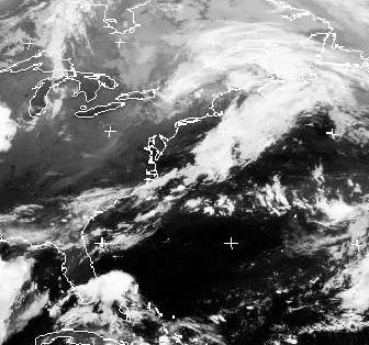 Ein Tiefdruckwirbel liegt mit seinen Wolken über dem Nordosten der USA und dem Osten Kanadas. In seinem Bereich kommt es auch zu teils kräftigem Regen. Ein Ausläufer verläuft über den Atlantik südwestwärts bis in den Südosten der USA, wo er in die Bewölkung der, sich hier in feuchter Luft bildenden, Schauer und Gewitter übergeht. Sonst zeigen sich unter Hochdruckeinfluss über dem Osten der USA kaum Wolken.