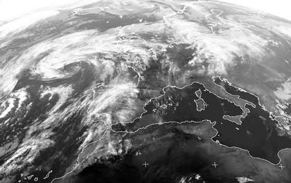 Das Satellitenbild zeigt das Wolkenband einer schwach ausgeprägten Kaltfron zwischen Dänemark und Böhmen. Westlich von Irland liegt ein Tief auf dessen Vorderseite feuchtwarme Luft aus dem Mittelmeerraum nach Mitteleuropa eingeflossen ist, es bilden sich vor allem in Spanien und Frankreich Gewitter. Am rechten Bildrand erkennt man die Wolken eines schwachen Tiefs bei Griechenland.