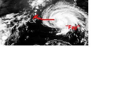 Auf dem Satellitenbild von Freitag früh ist der tropische Sturm 'Fay' über Florida gut zu erkennen. Zurzeit erreicht er mittlere Windgeschwindigkeiten von 95, in Böen 110 km/h. Berechnungen zufolge soll 'Fay' entlang der Küste weiter nach Westen ziehen und sich dabei langsam abschwächen. Es muss mit ergiebigen Regenfällen gerechnet werden. (Bildquelle: NERC Satellite Receiving Station, Dundee University, Scotland, http://www.sat.dundee.ac.uk/)