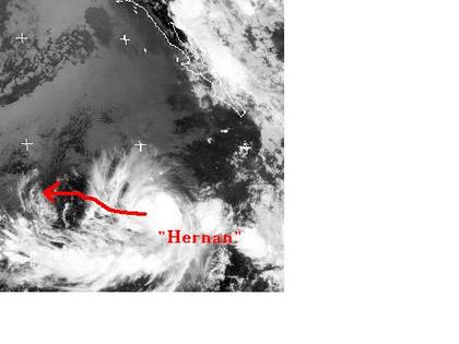 Im Pazifik, westlich von Mexiko, hat sich der tropische Sturm 'Hernan' aufgewirbelt. Zurzeit erreicht er mittlere Windgeschwindigkeiten von 102, in Böen 120 km/h. Berechnungen zufolge soll er sich noch weiter verstärken und weiter Richtung Westen ziehen. Sein Endziel ist zurzeit noch unklar. (Bildquelle: NERC Satellite Receiving Station, Dundee University, Scotland, http://www.sat.dundee.ac.uk/)