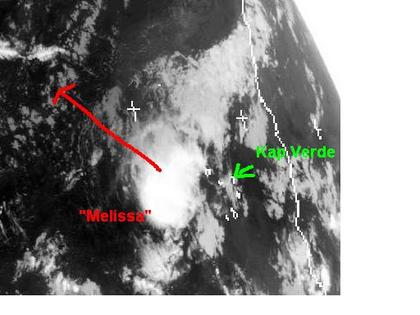 Auf dem Atlantik, westlich Kap Verde hat sich der tropische Sturm 'Melissa' aufgewirbelt. Zur Zeit erreicht er mittlere Windgeschwindigkeiten von 75 km/h und zieht nach Nordwesten. Sein Endziel ist noch unklar. (Bildquelle: NERC Satellite Receiving Station, Dundee University, Scotland, http://www.sat.dundee.ac.uk/)