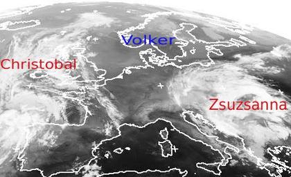 Auf dem heutigen Satelittenfoto zeigt sich ein breiter Streifen von Süd- bis Nordeuropa unter Hochdruckeinfluss bei nur wenigen Wolken sehr freundlich. Einige Niederschläge werden einerseits im Bereich des Tiefs 'Zsuzsanna' über Ungarn registriert und andererseits in einem Streifen von Nordportugal, über Irland bis nach Schottland.