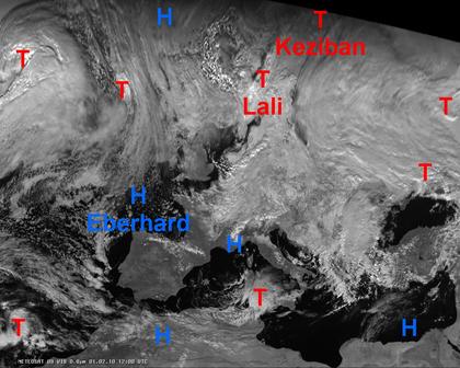 Das heutige Satellitenbild zeigt mehrere Tiefdrucksysteme über dem Norden und Osten Europas. Dort kommt es bei überwiegend dichter Bewölkung verbreitet zu Schneefällen, die gebietsweise auch kräftig ausfallen. Auch über Mitteleuropa sind verbreitet Schneefälle möglich. Von der südlichen Adria bis zur Ägäis kommt es bei vielen dichten Wolken zeitweise zu Schauern oder kurzen Gewittern. Ein weiteres Tief bringt im zentralen Mittelmeer gebietsweise Schauer und teils Gewitter. Deutlich freundlicher und meist trocken ist es in Südosteuropa.