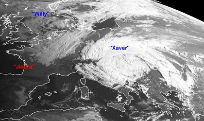 Das Satellitenbild von Donnerstag morgen zeigt dichte Bewölkung quer über Deutschland. Sie ist nicht besonders hoch, gehört zur Warmfont des Nordmeertiefs 'Willy' und bringt meist nur leichten Niesel- oder Sprühregen. Anders sind die Wolken von Tief 'Xaver' über Südosteuropa. Sie erscheinen weißer und reichen höher. Hier kommt es zu teils ergiebigen Niederschlägen. Auch der Südosten Bayerns wird von den Ausläufern gestreift. In Südwesteuropa befinden sich dagegen kaum Wolken am Himmel. hier sorgen die Absinkprozesse von Hoch 'Jindra' für Wolkenauflösung und schönes Wetter. (Bildquelle: NERC Satellite Receiving Station, Dundee University, Scotland, http://www.sat.dundee.ac.uk/)
