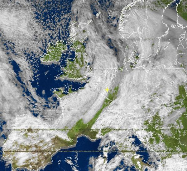 Auf dem Satellitenfoto von heute Nachmittag ist ein langgestrecktes Wolkenband zu erkennen, das über den Norden der Iberischen Halbinsel, Frankreich, Benelux, über die Nordsee bis nach Skandinavien verläuft. Unter den dichten Wolken fällt verbreitet Regen oder Sprühregen und vor allem in den küstennahen Regionen weht zudem ein teils starker Wind.