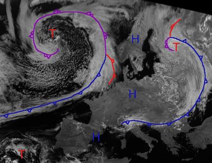 Eindrucksvoll zeigen sich heute die Wolken des Islandtiefs 'Peter'. Sie reichen von Island über die Britischen Inseln bis auf dem Atlantik hinaus. Auch im Osten bringt das Tief 'Odin' über dem Baltikum starke Bewölkung vom westlichen Russland bis nach Norditalien. Sonst herrscht in Europa meist Hochdruckeinfluss und sonniges Wetter. Die Ausläufer von Tief 'Peter' verlagern sich langsam nach Osten weiter, die Kaltfront zieht dabei morgen auch nach Deutschland hinein.