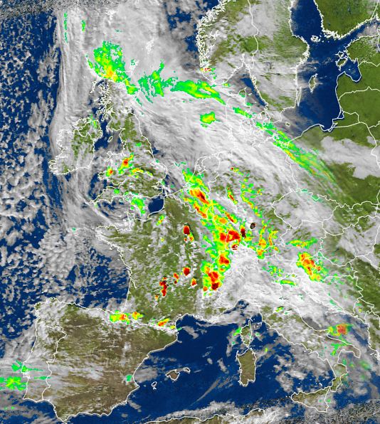 Auf dem europäischen Satellitenfoto von heute Nachmittag sind über Mitteleuropa zahlreiche Schauer- und Gewittercluster zu erkennen. Hierbei zieht ein kräftiger Ausläufer des Tiefs südlich von England mit vielfach dichte Regenwolken in nordöstliche Richtung über Deutschland hinweg.
