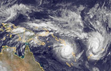 Auf dem Satellitenbild sind zwei tropische Stürme östlich von Australien zu sehen. Der westlichere Sturm heißt 'Ului' und wird unter Verstärkung weiter auf Australien zuziehen. Auch der östlichere, 'Thomas' genannt, wird sich weiter verstärken und nach Süden ziehen. Zur Zeit wird in dem Bereich von 'Ului' und 'Thomas' eine Windgeschwindigkeit von 120 km/h erreicht.