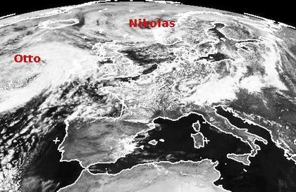 Auf dem Satellitenbild vom Freitagmittag erkennt man über Deutschland die aufgelockerte Bewölkung, die sich in der kühlen Luft auf der Rückseite der Ausläufer von Tief 'Nikolas' bei Norwegen gebildet hat. Teils kommt es zu Schauern. Über Österreich staut sich noch dichte Bewölkung. Auf dem Atlantik liegt bereits das Tief 'Otto', das am Sonntag Wolken in den Westen Deutschlands schicken wird. Zwischen den beiden Tiefs bestimmt jedoch am Samstag Hochdruckeinfluss das Wetter. (Bildquelle: NERC Satellite Receiving Station, Dundee University, Scotland, http://www.sat.dundee.ac.uk/)