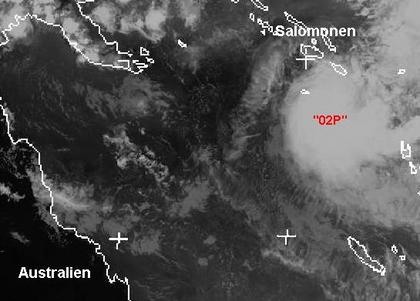 Über den Salomonen wütet derzeit der Zyklon mit der Bezeichnung '02P'. Die momentanen Windgeschwindigkeiten liegen bei 130 km/h. Übermorgen sollen Spitzenböen bis zu