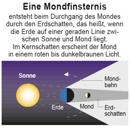 Zur Namensherkunft später. Die kommende Nacht ist zunächst einmal eine Vollmondnacht, in der sich die Erde zwischen Sonne und Mond schiebt. Bei der hierbei enstehenden Mondfinsternis, die heute Abend kurz nach 23:30 Uhr einsetzt, stehen Sonne, Mond und Erde aber nicht auf einer geraden Linie.